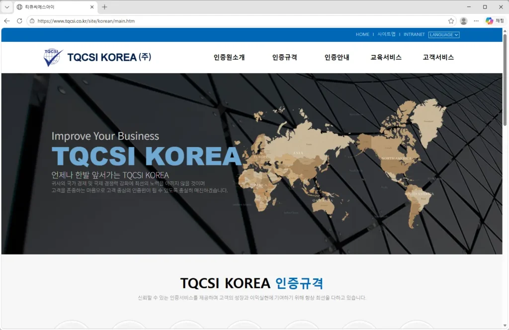 • 인증 획득 과정: 품질 경영을 위한 ISO 9001과 환경 경영을 뜻하는 ISO 14001은 기업이 갖춰야 할 필수적인 인증 인프라입니다. 티큐씨에스아이는 기업의 현황 수치를 파악하여 규정에 맞는 심사 경로를 제공합니다.